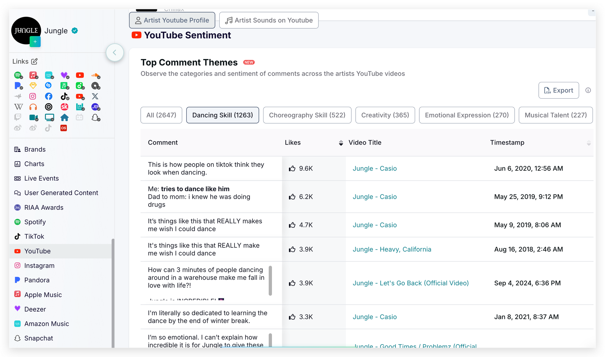 YouTube comments offer nuanced insights that raw numbers can't capture. Are fans praising your artist's vocal ability? Discussing the meaning behind lyrics? Creating memes about a memorable moment? Comments reveal how the general public perceives your artist and what the conversation around them looks like, and we analyze thousands of comments across all your artists music to give you the key recurring themes spanning their entire catalogue.
