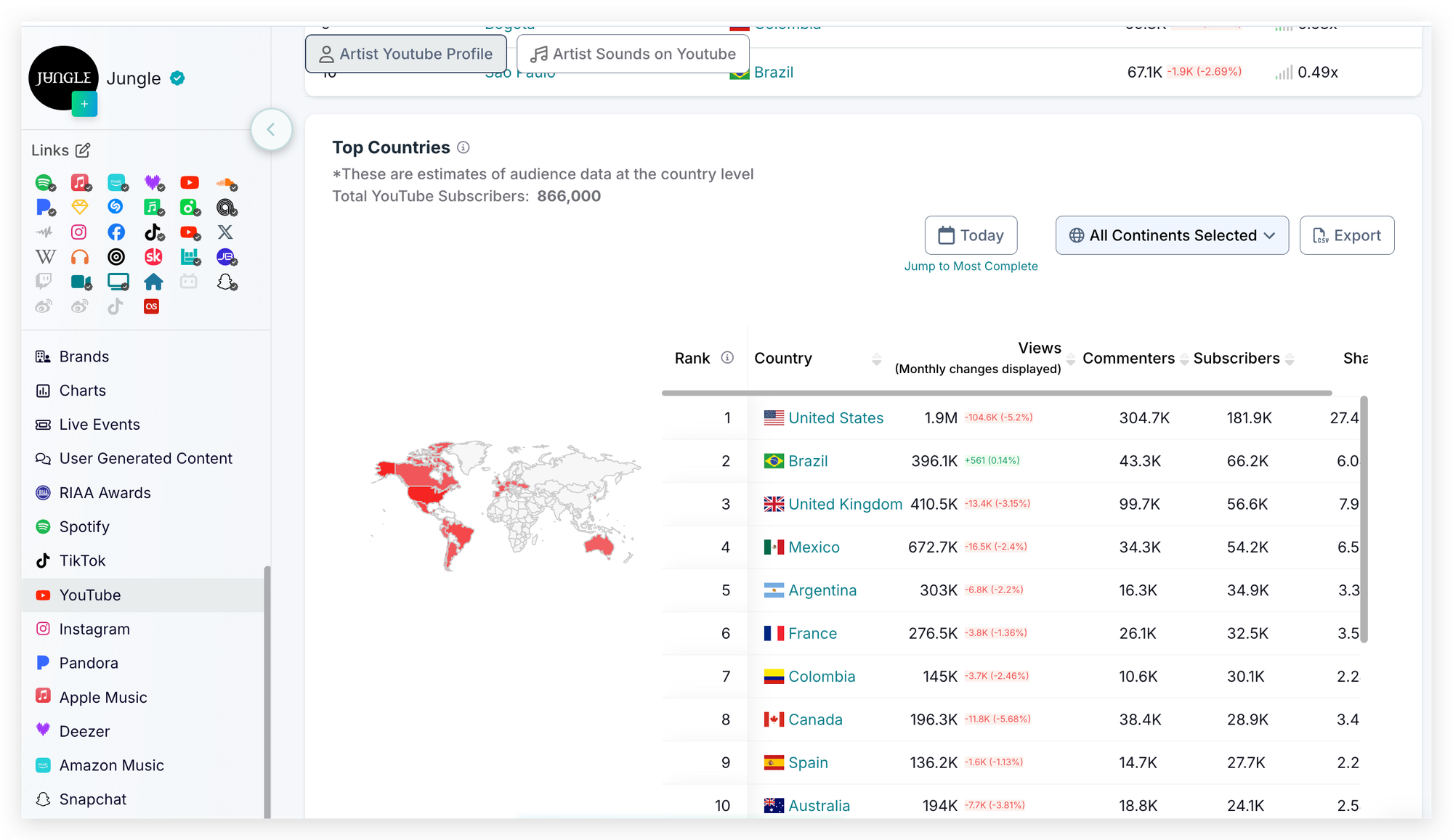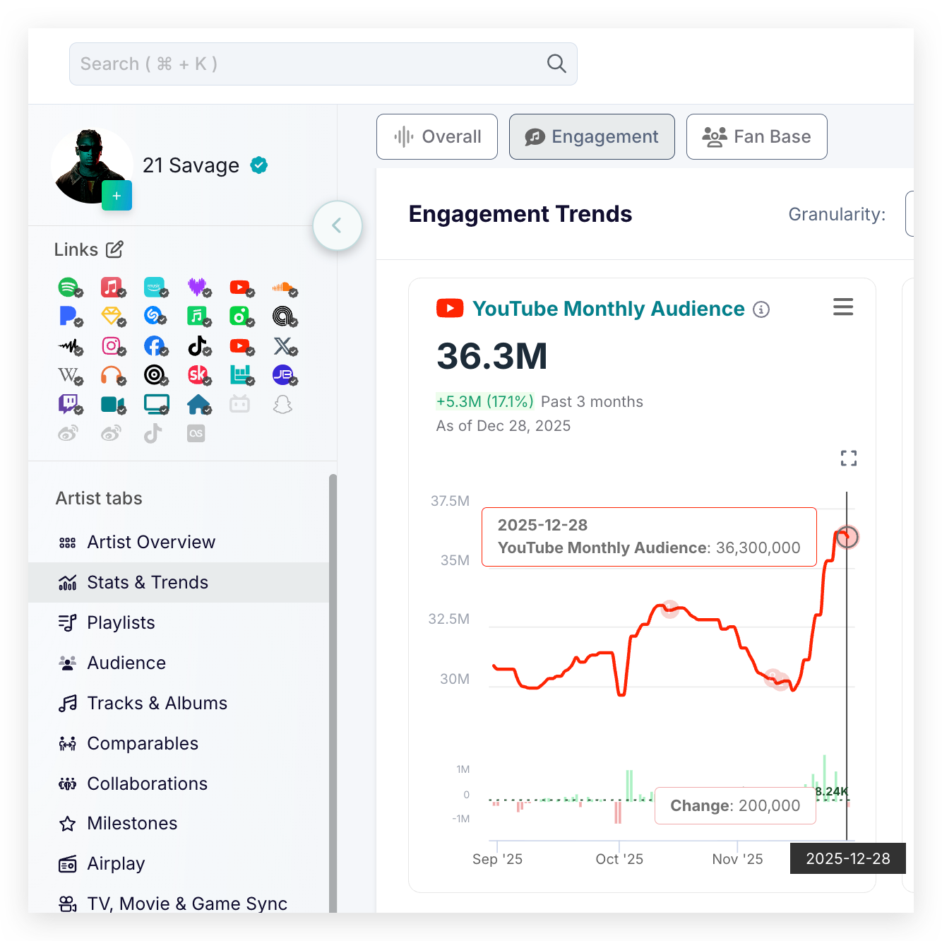 YouTube functions as both a major streaming platform and a social hub where audiences interact with their favorite artists. From official music videos to fan-created content, short-form viral clips to comment conversations, YouTube offers unique insights that no other platform can provide. Understanding this data gives you a competitive edge in developing your artist's strategy and measuring their true impact.