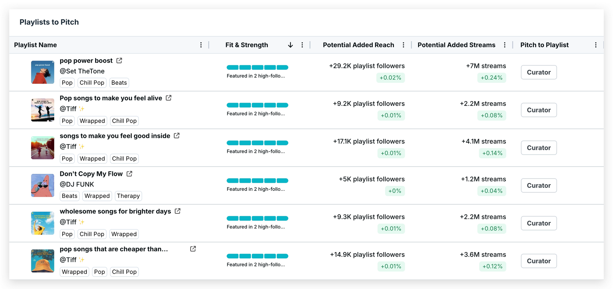 Pro tip: Use the Fit & Strength score in Playlists to Pitch to prioritize your outreach. It factors in genre match, listener overlap, and playlist health so you're not just chasing follower counts. Pair that with the Potential Added Reach and Potential Added Streams columns to estimate real impact before you pitch. If a playlist shows high followers but minimal added streams, that's a signal to dig deeper before investing your time.