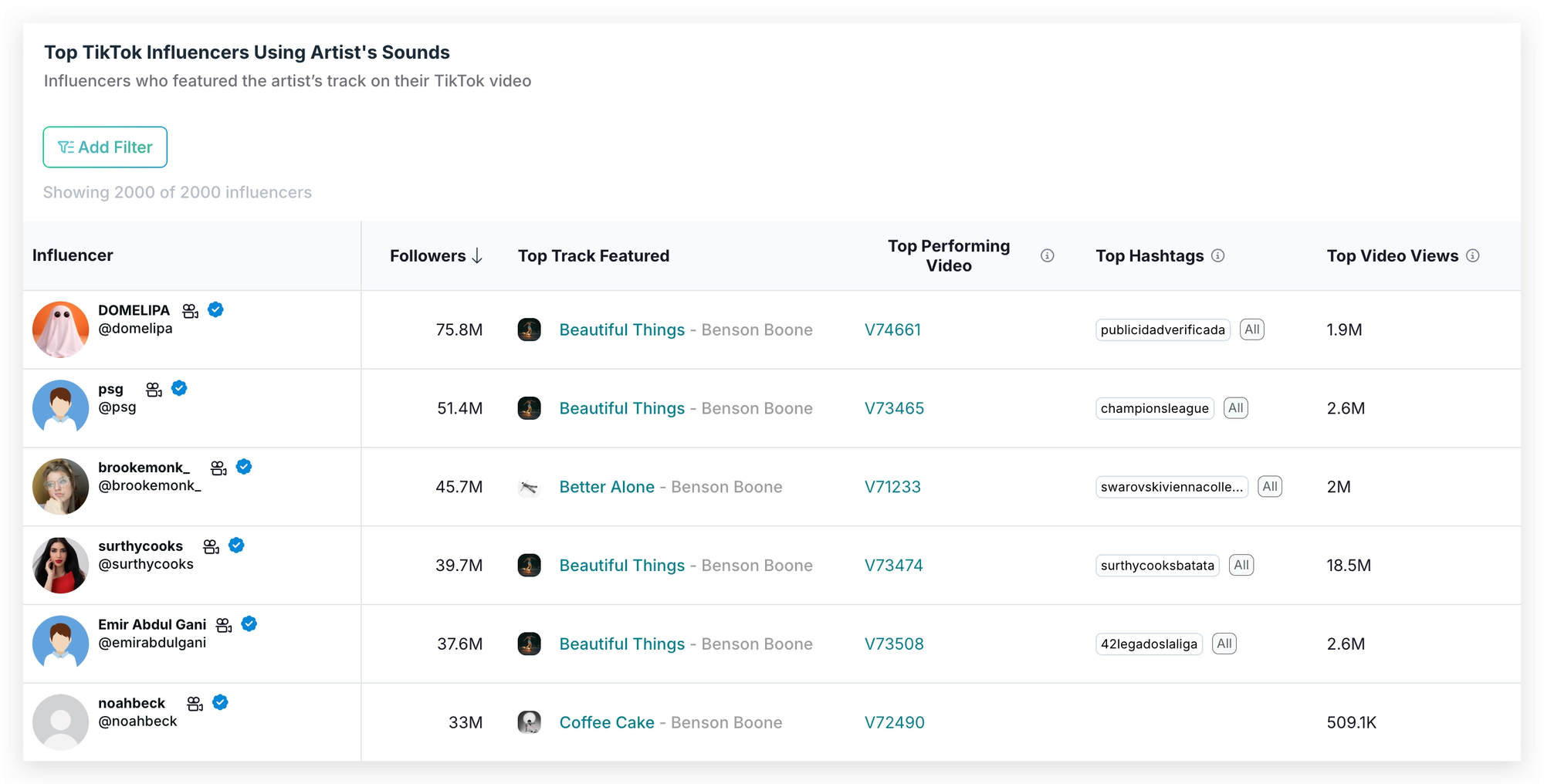 Chartmetric's Top Influencers table on your Artist Page shows you exactly which TikTok creators have already featured your tracks in their short-form videos, along with detailed engagement metrics: video views, likes, comments, and follower counts.