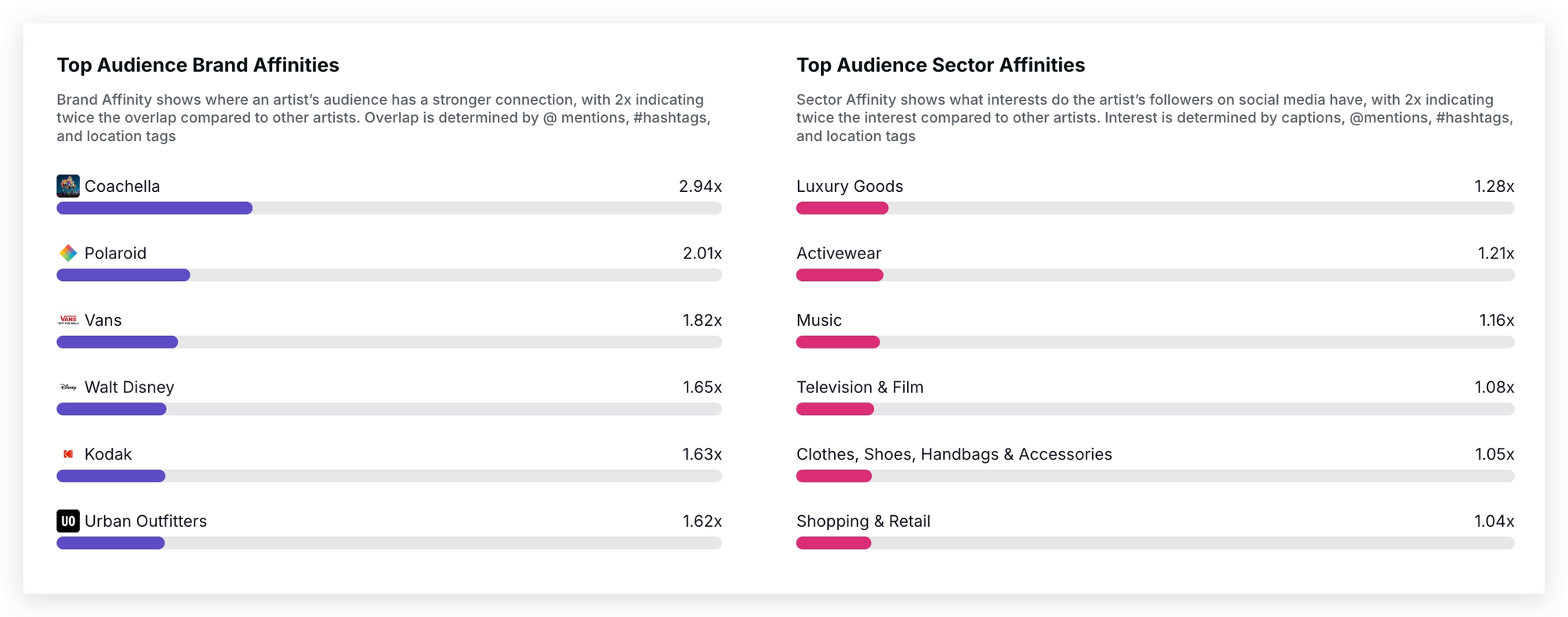 Pro tip: Check the Sector Affinity data in Chartmetric to see which product categories resonate most with your audience. If activewear ranks high, for example, start reaching out to local or emerging activewear brands in your area — they're more likely to partner with indie artists and give you creative flexibility. Small, well-matched deals build a track record that makes bigger brand partnerships easier to land down the line.
